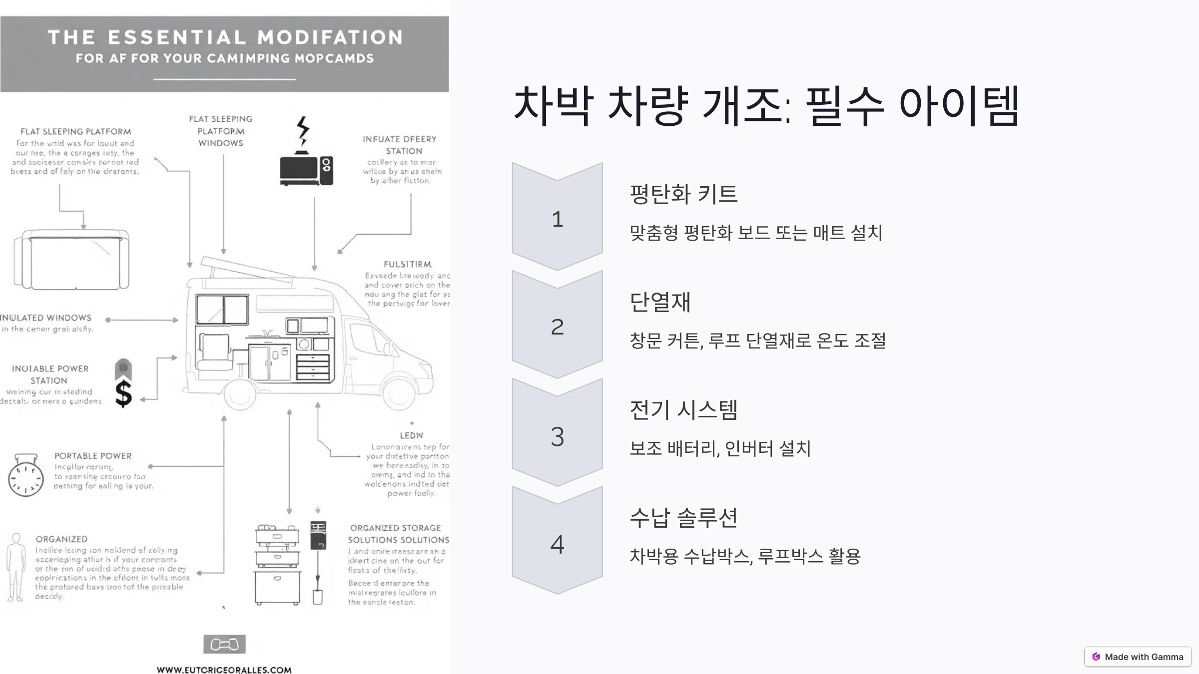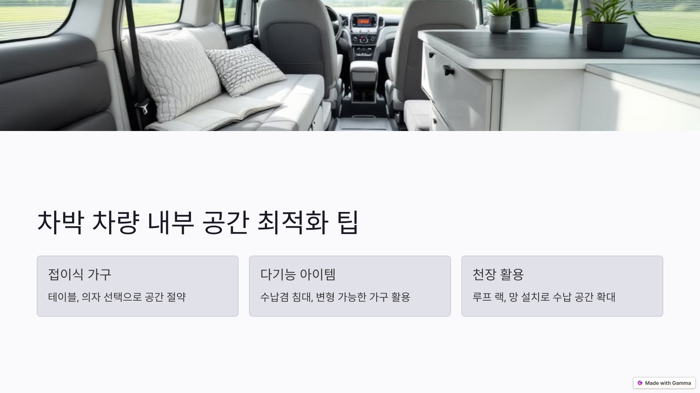 특히, 수면 공간 확보, 수납 최적화, 전력 시스템은 차박 필수 개조 요소예요. 🚗💡